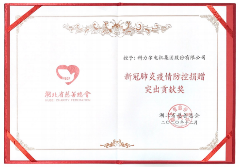 2021年2月22日,科力爾電機集團股份有限公司收到湖北省慈善總會(huì )頒發(fā)的“新冠肺炎疫情防控捐贈突出貢獻獎”獎牌及獎勵證書(shū)。